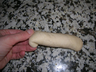 7. Una vez enrollada la masa terminamos de darle forma al panecillo doblando las puntas hacia abajo y seguidamente le daremos unas vueltas presionándolo sobre la encimera para que las juntas queden bien selladas.